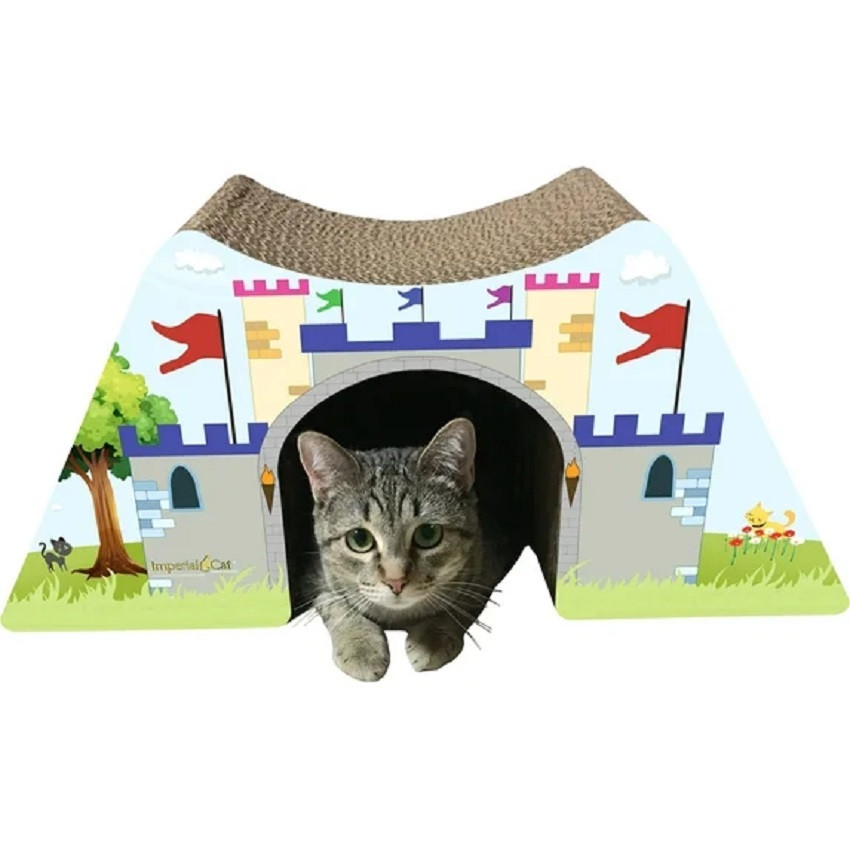 This cat scratcher is built to please all the princes and princesses out there! Contains a 7" Tall x 7" Wide opening that cats love to crawl through! The Imperial Cat Scratch 'n Shapes Castle is the ideal cat scratcher - made from rough, durable corrugated cardboard, the Imperial Cat Scratch 'n Shapes Castle mimics the feel of real tree bark, so it feels natural to kitty's claws and paws. The Imperial Cat Scratch 'n Shapes Castle is designed to rip and tear under your kitty's claws, providing for great visual marking, a main reason your cat scratches in the first place. You think it looks torn up and ugly, but your cat thinks it looks like home! Contrary to popular belief, your cat doesn't scratch to "sharpen" his claws, but rather to remove the outer layer of nail, which sheds naturally every few weeks. And the corrugated cardboard is a unique surface in your home, it feels different than your carpet or sofa, so it's easier to train your cat to use the Imperial Cat Scratch 'n Shapes Castle instead of your furniture. Plus, it just feels good for your kitty to stretch out and scratch away! Cats may also like to sleep and play on the Imperial Cat Scratch n' Shapes Castle, and that's okay. The Imperial Cat Scratch n' Shapes Castle is made with non-toxic paper, ink, and glue, so it's purrfectly safe for cats and kittens. Every Imperial Cat Scratch 'n Shape Castle comes with a bag of Imperial Cat Pure All-Natural Catnip - sprinkle on a little or sprinkle on a lot for an aroma that will attract your cat like a magnet and get the fun started!