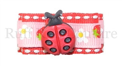 If you are a lover of lady bugs accessorize your dog with this happy Baby Lady Bug barrette. The 3D ladybug centerpiece is sewn with onto the center of this bow. In true Ruff Ruff Couture® fashion, this USA made product has two layers of patterned ribbons. The top layer is made from pink grosgrain ribbon with printed flowers and strawberries and the bottom layer features a red saddle stitch ribbon.