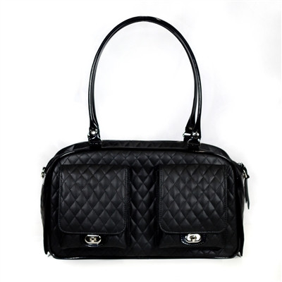 Made with lightweight quilted fabric with shiny black patent trim. It features a top zip easy entry with a large exterior flap pocket and a zippered pocket on back. It is vented on both sides with privacy flaps to cover the mesh- they can be folded up when wanted or placed down to conceal your dog. Features a silver chain handle with black patent straps. Removable faux fur bedding with interior safety strap.