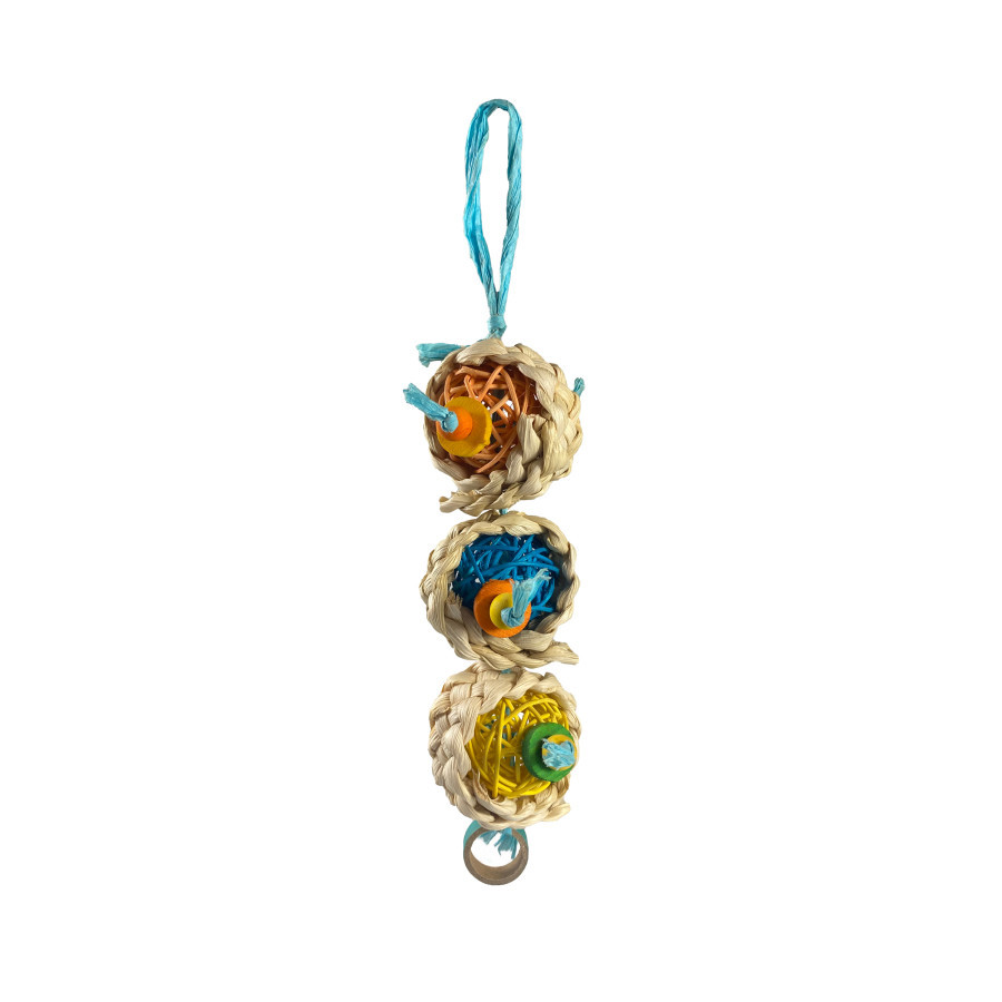 Happy Beaks Sushi Shredder is the perfect toy for birds that love to chew and shred. It's various textures and materials will keep your bird engaged for hours. It is made with colorful vine balls, wooden rings, and vine spheres. You can add your pet's favorite treats inside the vine balls as added foraging fun. Easily attaches to your bird's cage. Best suited for medium-sized birds.