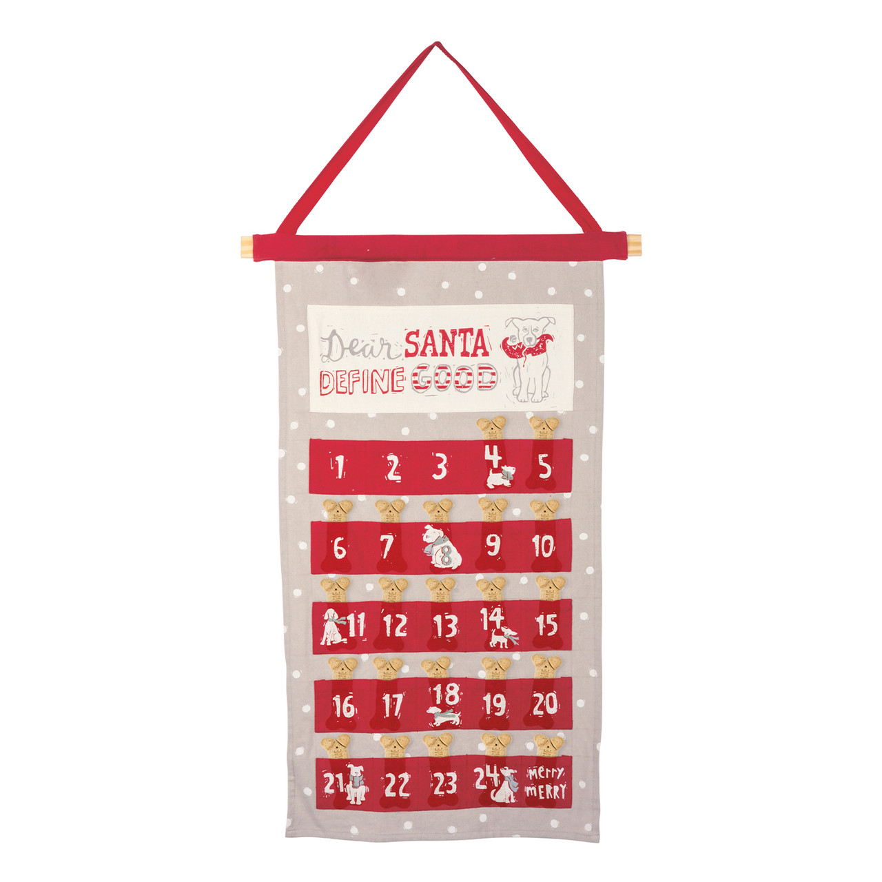 This hanging fabric advent calendar features a charming block print sentiment at the top that reads "Dear Sant - Define Good," adding a playful holiday touch. Numbered pockets allow you to count down the days until Christmas, making the season fun and interactive. Decorated with dog-centered designs throughout, it brings festive cheer for pet lovers. A convenient fabric loop at the top ensures easy hanging. This calendar complements coordinating pieces perfectly, creating a cohesive holiday collection for your home.