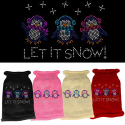 Snuggle your pooch up in this adorable penguin sweater featuring multi-color rhinestones with the holiday expression " Let it snow!" Available in black, cream, red or pink.